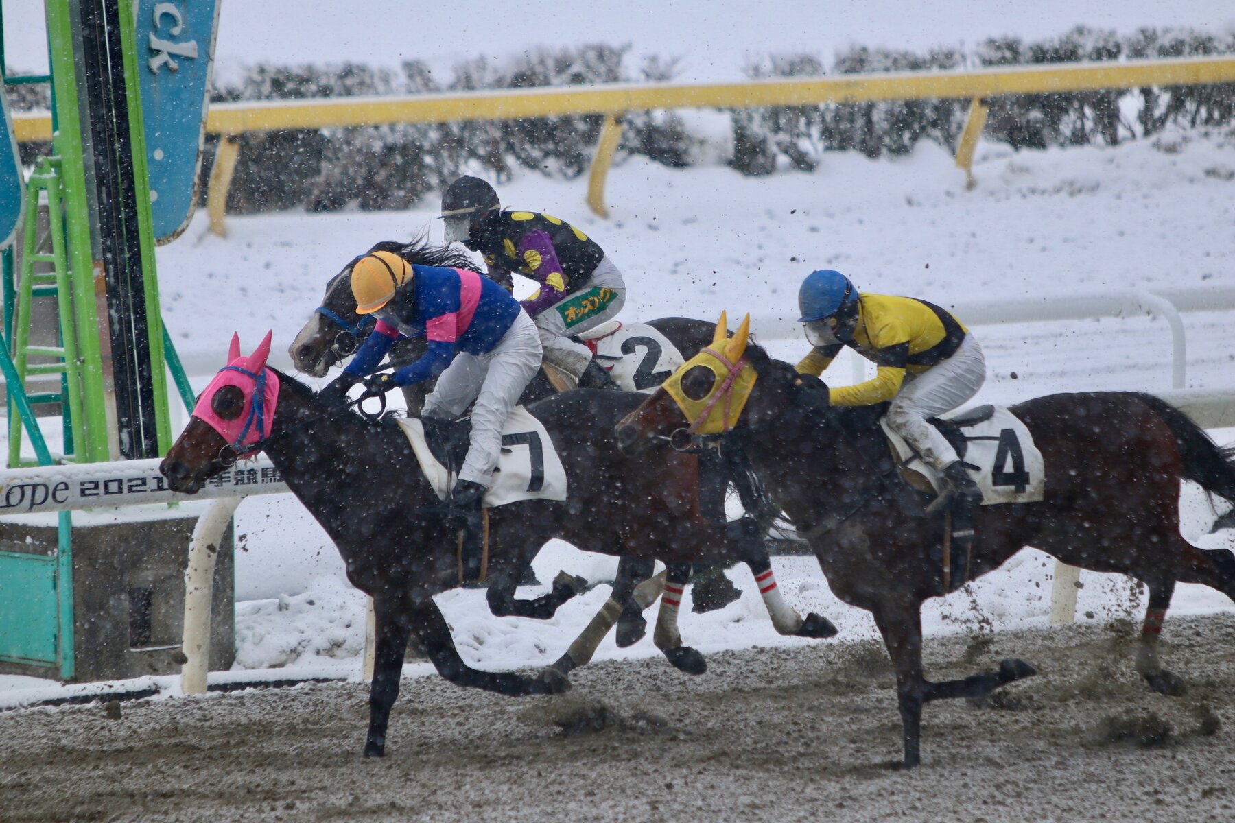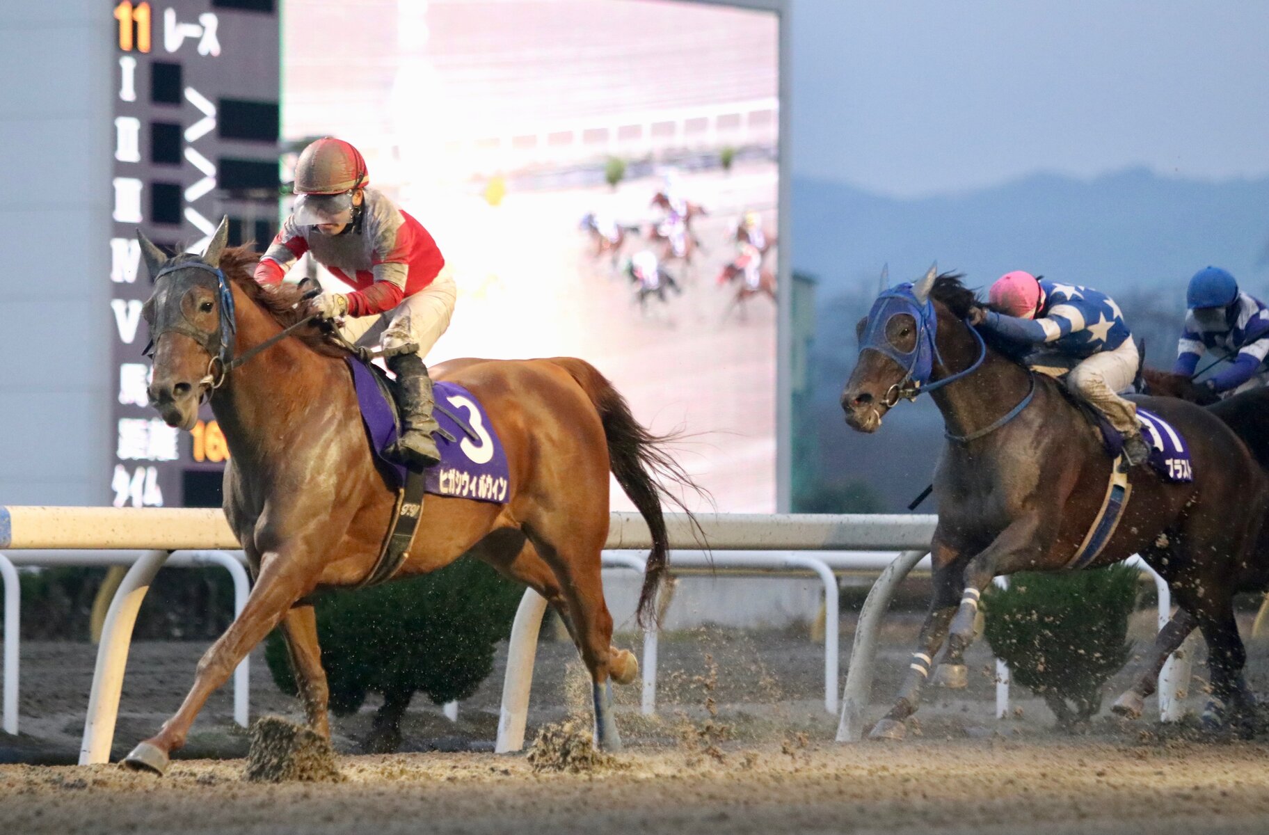 ホッカイドウ門別から移籍してきたデビュー馬&経歴馬たちの活躍が続いている岩手競馬・冬の水沢シリーズ。本日も小雪がちらつく中、第1競走「2歳B2二組/1400m」第2競走「2歳B2一組/1400m」に門別デビューの2歳馬たちが複数出走。1Rは堂山芳則厩舎からデビューしたフィールドグーフィー(牡2・父グランプリボス)が勝利し、田中淳司厩舎デビューのヴォルテッラ(牝・トーセンジョーダン)が3着。続く2R📷は角川秀樹厩舎デビューのカマポコショクニン(牝・父イスラボニータ)が2着、小国博行厩舎デビューのライラックベルン(牝・父シビルウォー)も差のない3着に入り、門別デビュー2歳馬たちが頑張りを見せてくれました!