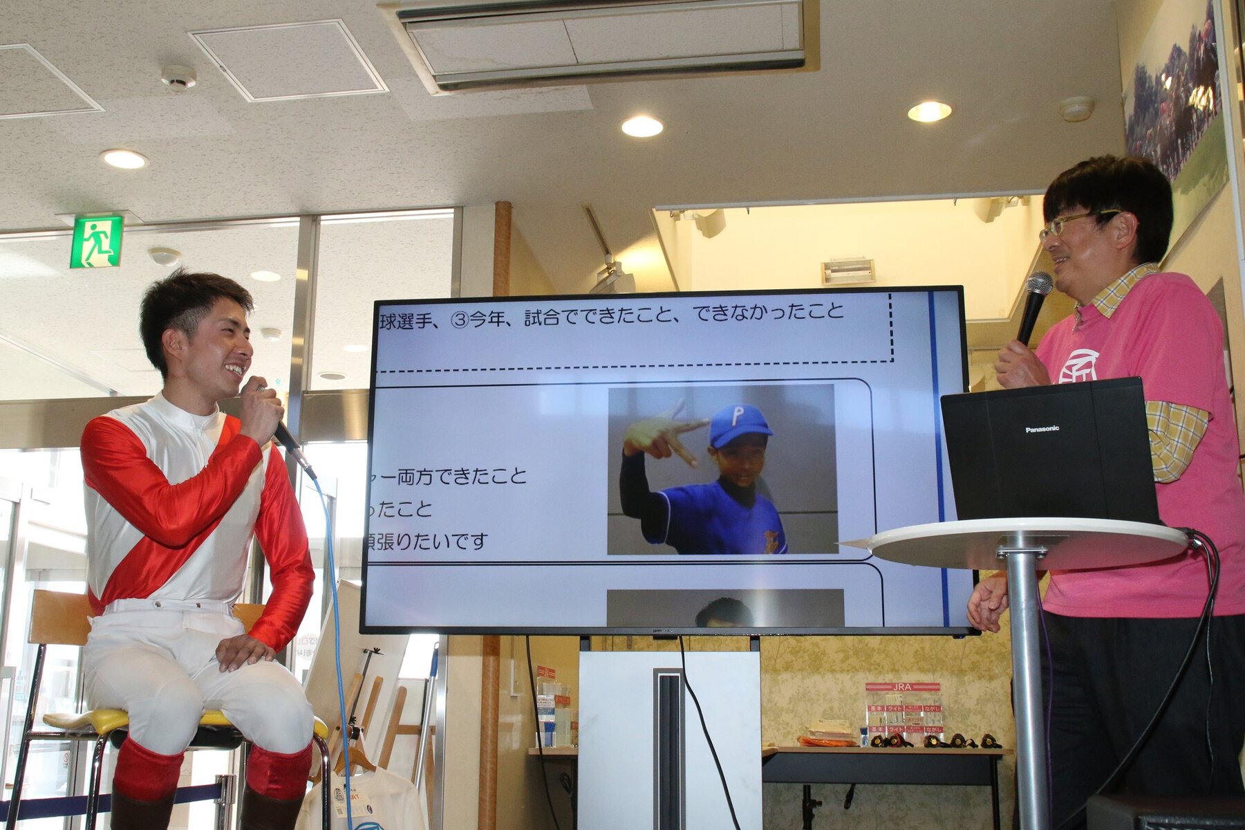 イベントでは幼少期に浜益地区の広報誌に掲載された秘蔵写真? が披露されたほか、石狩での生い立ちから静内農業高校~地方競馬教養センターを経て、ホッカイドウ競馬でデビューした1年目の振り返り、勝ってうれしかったレース(ロザシアニンで挙げた初勝利、重賞騎乗が可能となる10勝目を達成したオーソレリカのアタックチャレンジとのことです)やオフシーズンの過ごし方、明け2歳馬を馴致していくうえでの苦労などをトーク。