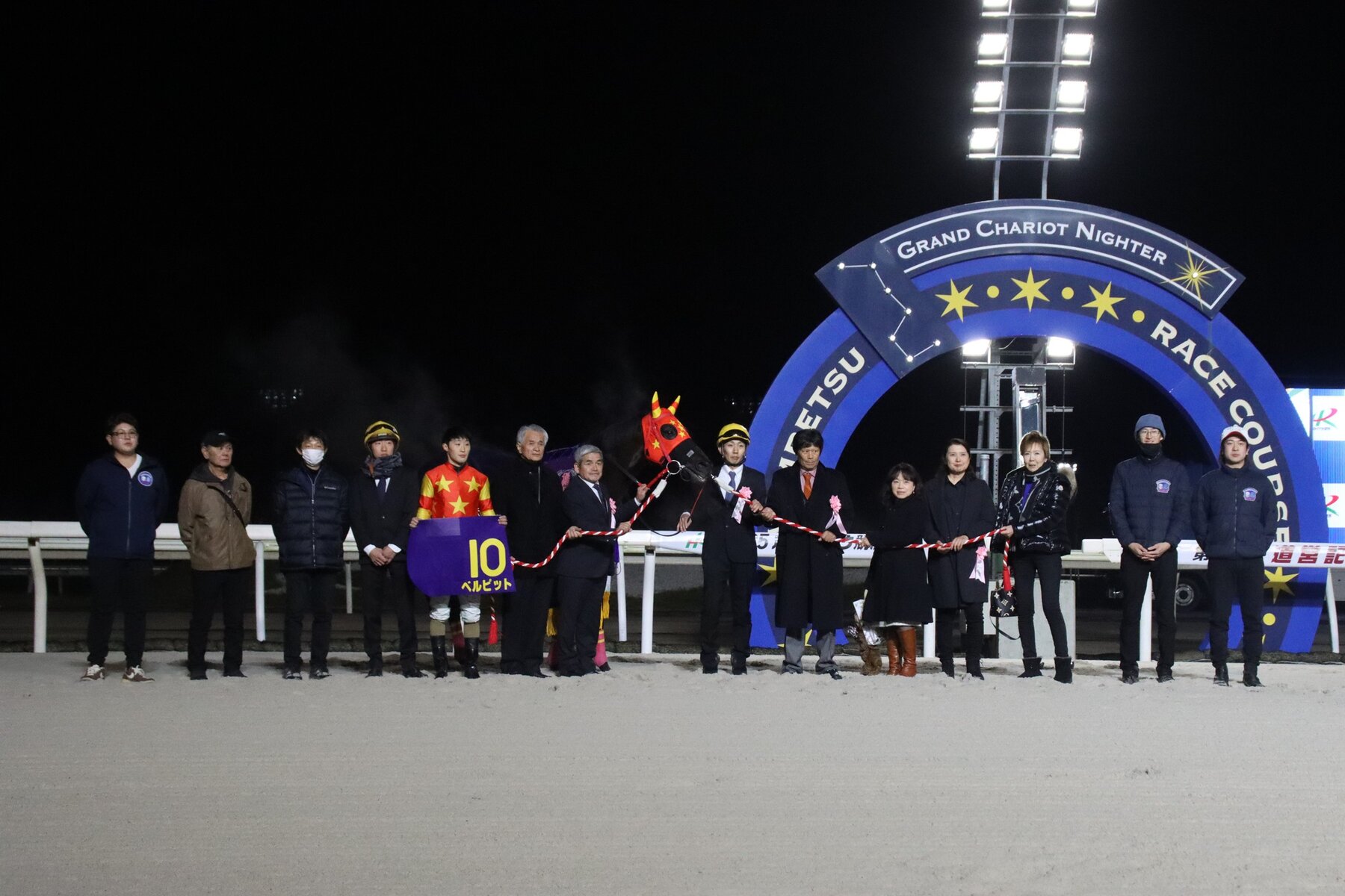 6日(木)門別12R・農林水産大臣賞典第68回道営記念〔H1〕(タイトルホルダー賞)(3歳上オープン、ダ・外2,000m)は、自ら淀みのないラップを刻んだ⑩ベルピット(牡5=角川秀樹厩舎、父パイロ、厚賀古川牧場=日高町生産)が後続をねじ伏せて逃げ切り。